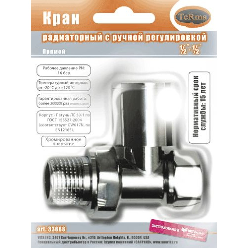 Кран прямой хромированный для радиатора 1/2" с ручной регулировкой с круглой ручкой TeRma 33666 предназначен для поддержания требуемой температуры воздуха в помещении путем регулирования потока теплоносителя через отопительный прибор (радиатор, конвектор) в ручном режиме. Ручной вентиль является самым простым способом терморегуляции, его допускается монтировать в любом положении.