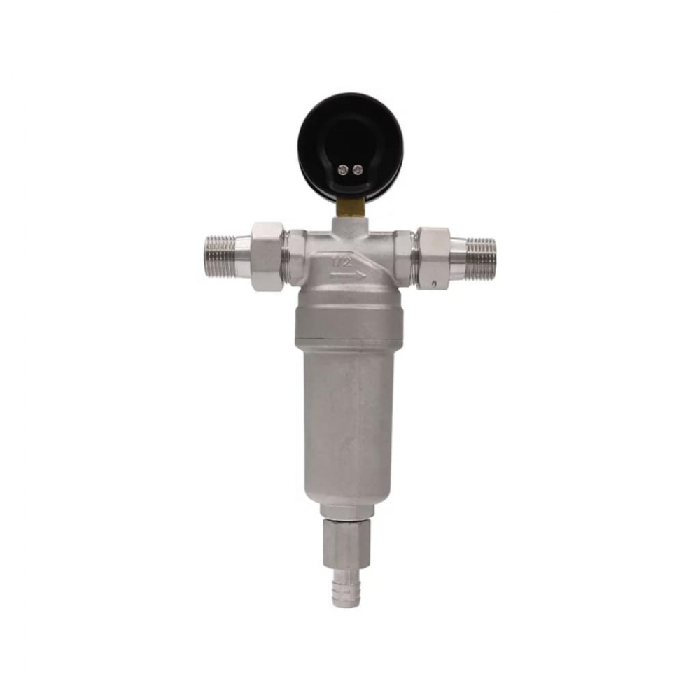 Самоочищающийся фильтр с манометром для систем горячего водоснабжения. Устройство задерживает механические примеси и оснащено механизмом обратной промывки, который активируется вручную поворотом ручки. Корпус выполнен из латуни, колба — из термостойкого материала.