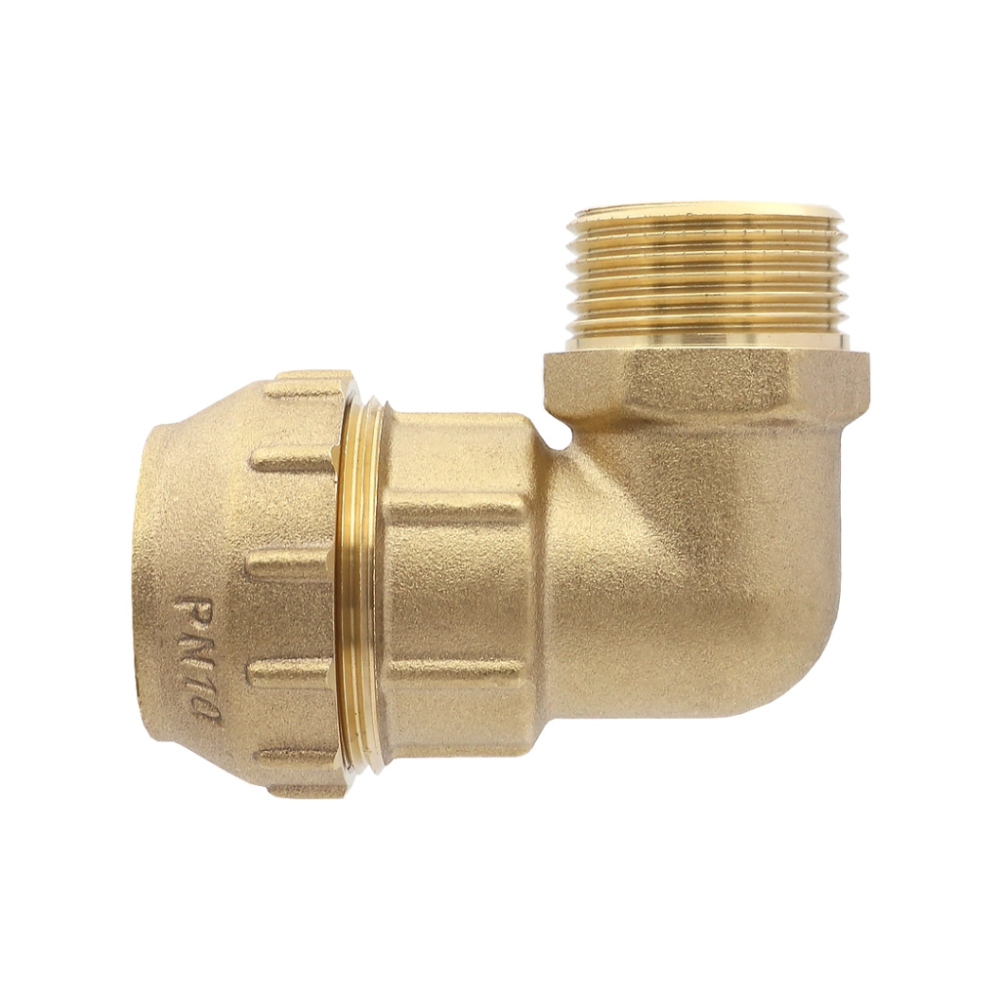 Латунный компрессионный угольник служит для изменения направления трассы трубопровода ПНД на 90 градусов и перехода на резьбовое соединение. Фитинг имеет обжимное подключение для трубы 32 мм и наружную резьбу размером 1 дюйм. Используется в системах холодного водоснабжения.