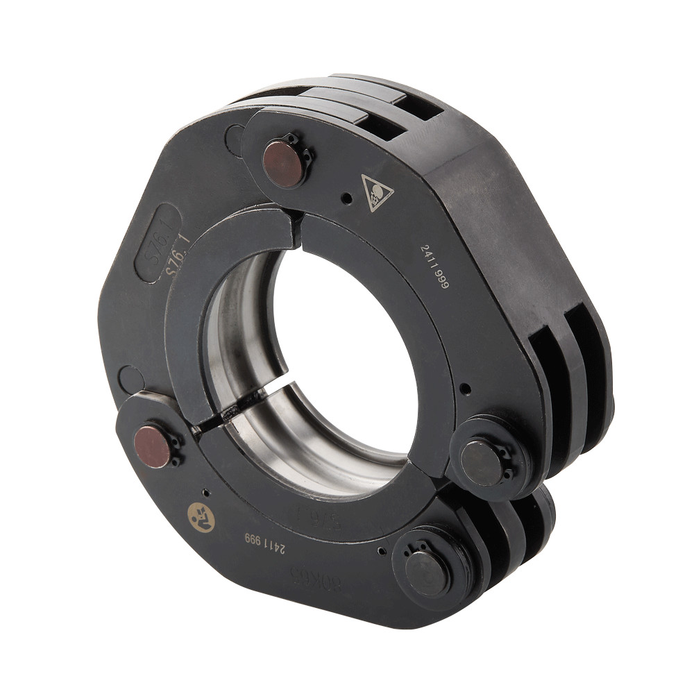 Работы осуществляются в следующем порядке: сначала на фитинг устанавливается пресс-кольцо, затем в пазы пресс-кольца вставляются губки пресс-адаптера, установленного на электроинструмент, и производится однократная опрессовка соединения.