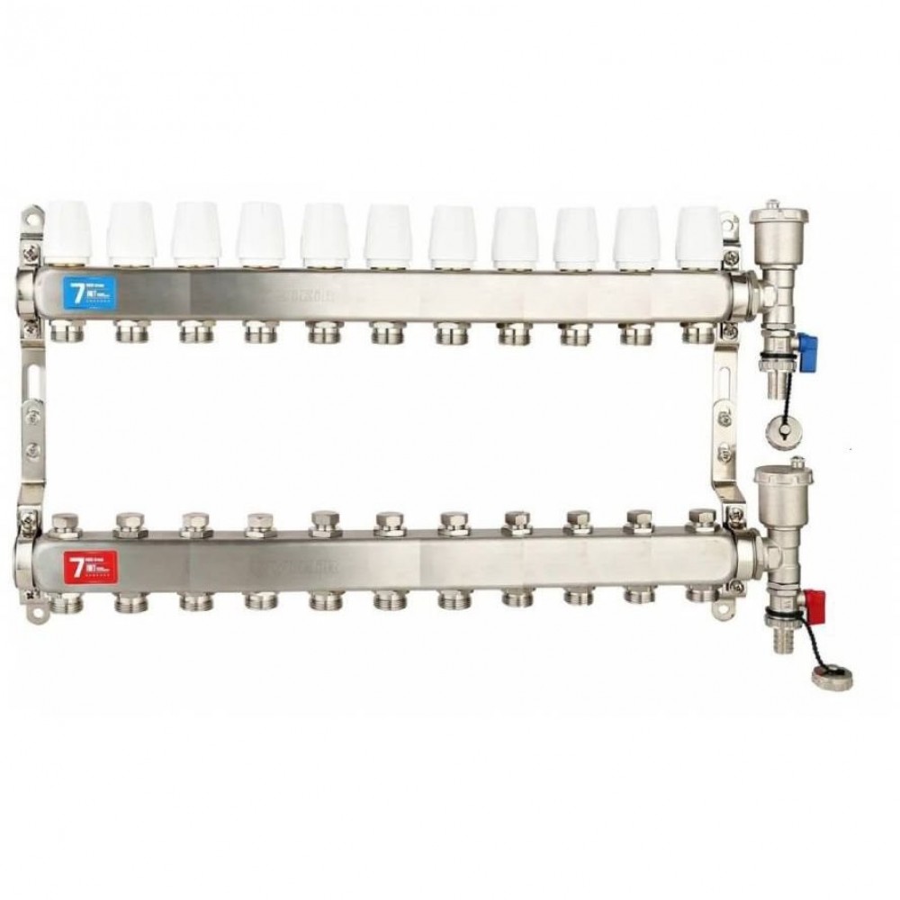 • ✓  Коллекторный блок с диаметром 1" и 11 выходами под евроконус 3/4" (НР) для распределения теплоносителя по контурам и обратного его сбора.