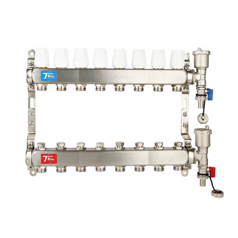 Коллекторная группа VIEIR VR115-08A 1"x3/4", 8 выходов — распределительный узел из нержавеющей стали AISI 304 для восьми контуров системы отопления или «тёплого пола» без расходомеров и без кранов.