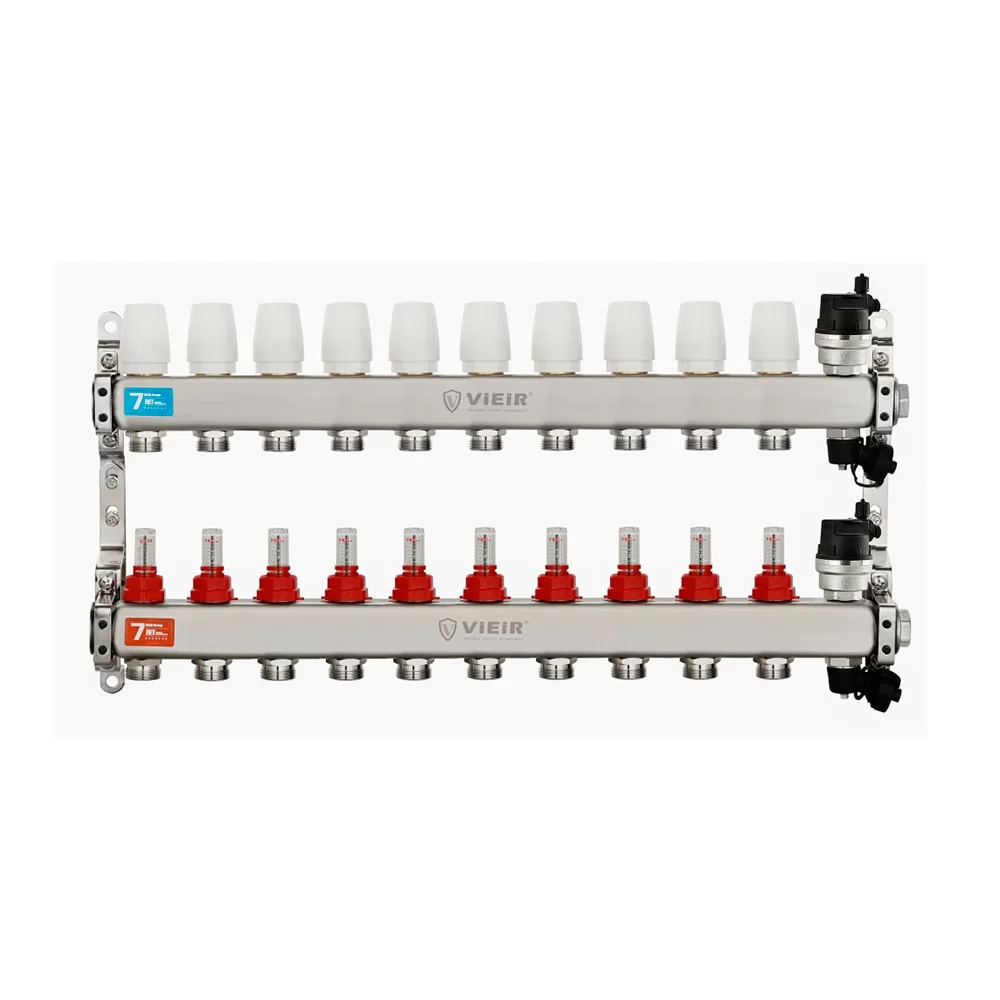Коллекторная группа VIEIR VR123-10A 1"x3/4", 10 выходов — распределительный коллектор из нержавеющей стали с расходомерами для систем водяного отопления и тёплых полов, рассчитанный на подключение десяти контуров. Исполнение без шаровых кранов на подающей и обратной линии.