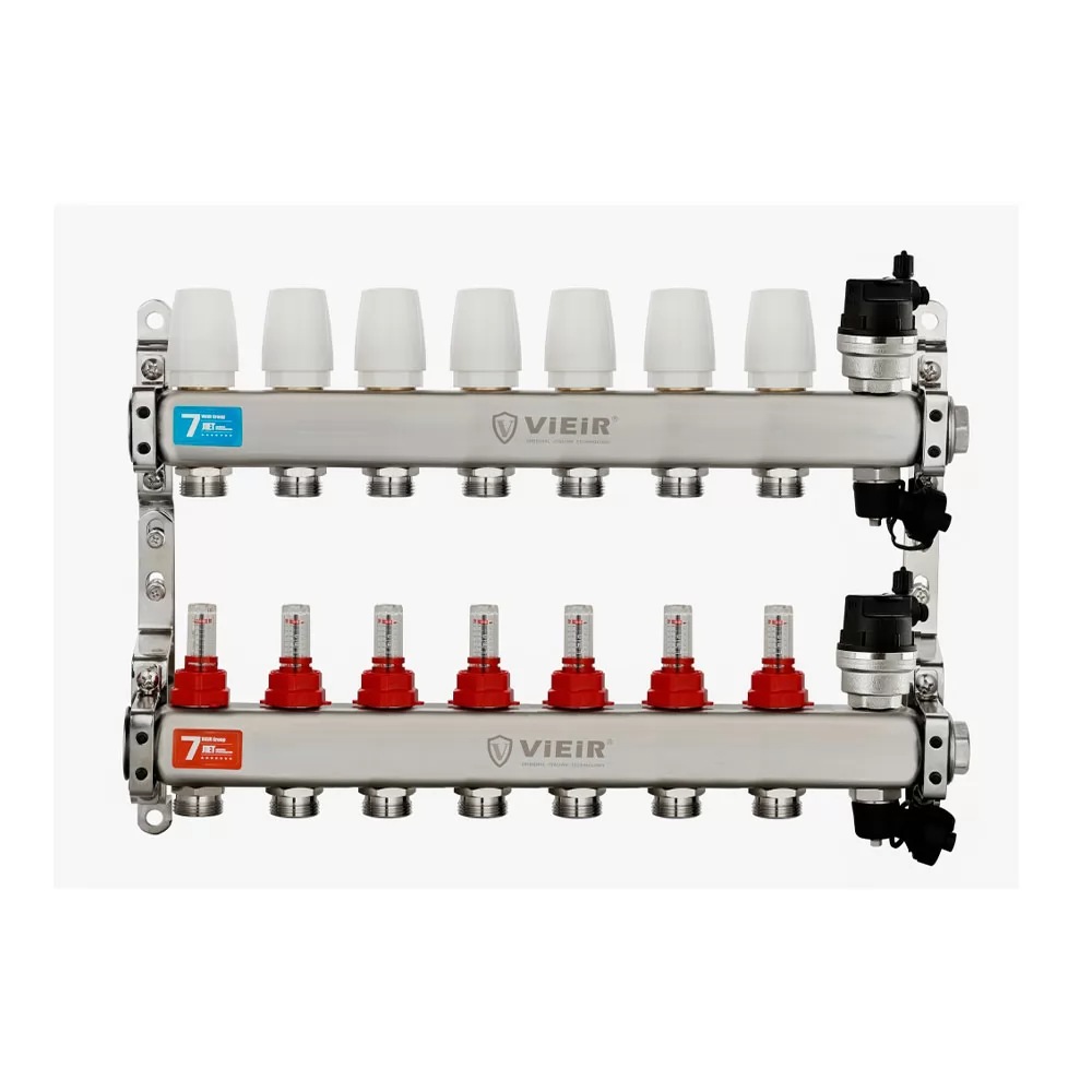 Коллекторная группа VIEIR VR123-07A 1"x3/4", 7 выходов — семиконтурный распределительный коллектор из нержавеющей стали с расходомерами для систем водяного отопления и тёплых полов, без шаровых кранов на входе и выходе.