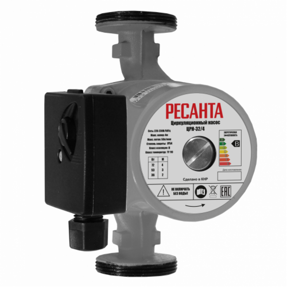 Циркуляционный насос Ресанта ЦРН-32/4 с трехступенчатой мощностью 36/53/72 Вт, максимальным напором до 4 м и потоком до 50 л/мин предназначен для циркуляции теплоносителя в системах отопления.