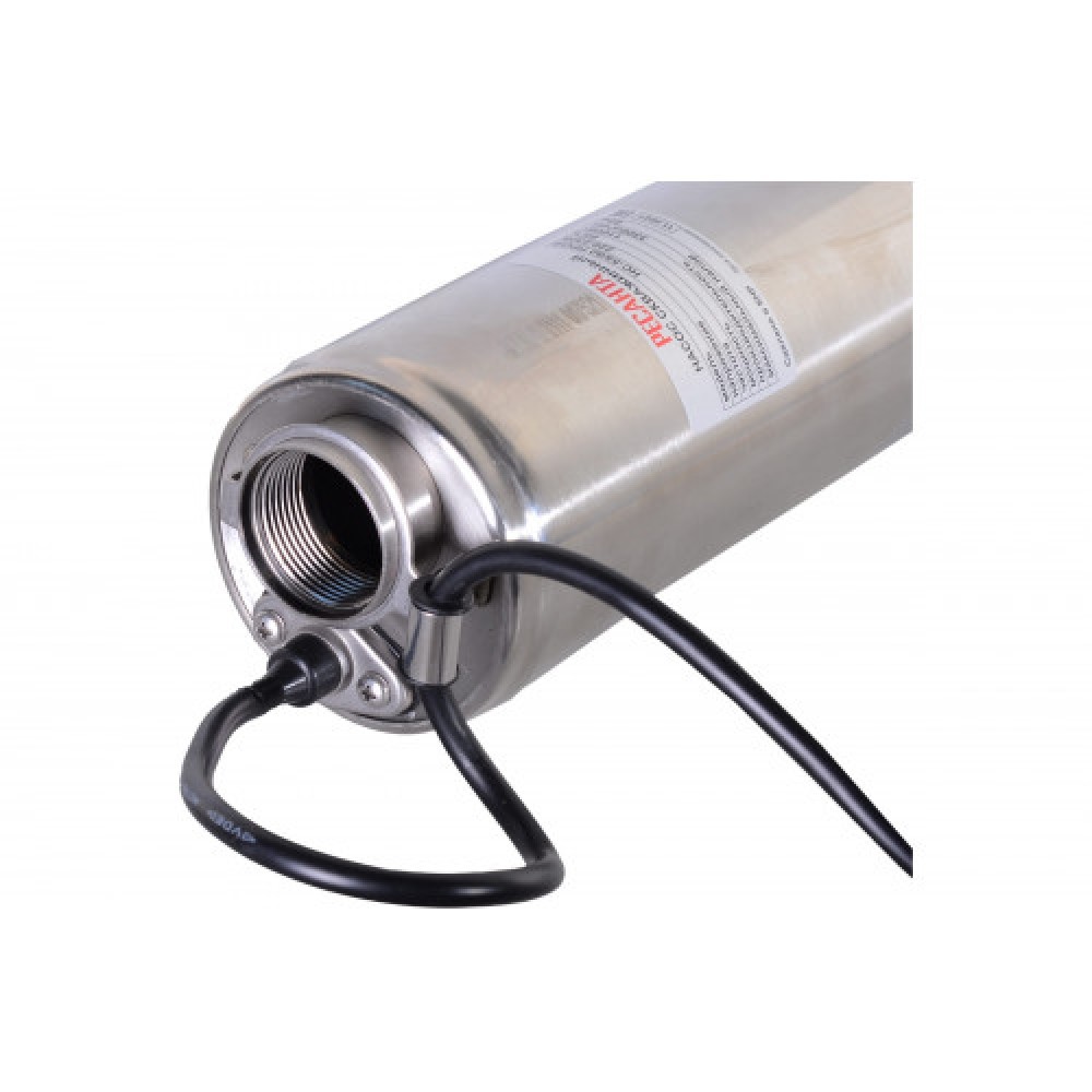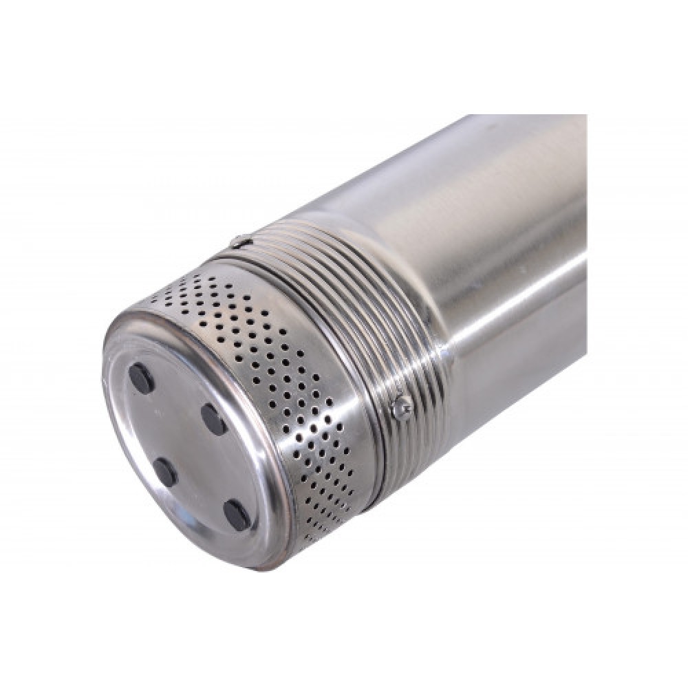 Цилиндрический корпус из нержавеющей стали диаметром 100 мм (4") рассчитан на погружную установку; подключение выполняется через выход 1,25", а кабель 30 м удобен для монтажа на глубине.
