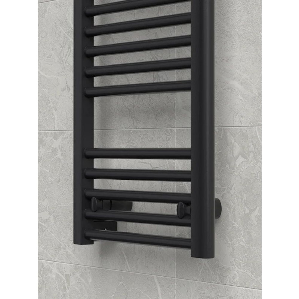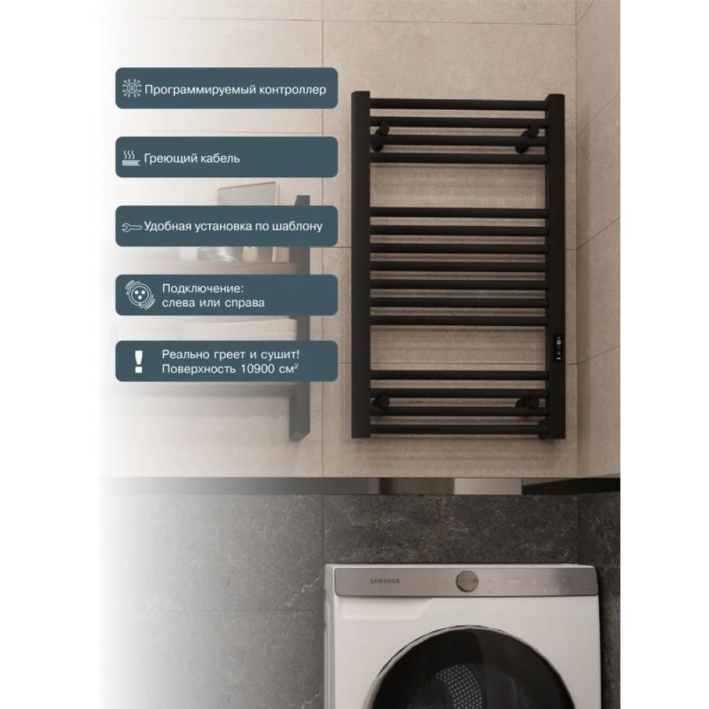 Электрический полотенцесушитель выполнен в современном дизайне и представлен в чёрном цвете. Устройство предназначено для быстрого и равномерного прогрева ванной комнаты, сушки полотенец и белья. Подходит для любых типов помещений, включая квартиры и частные дома.