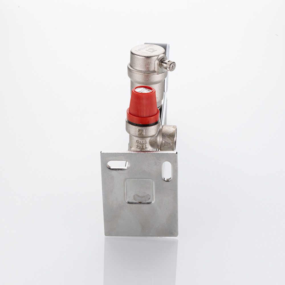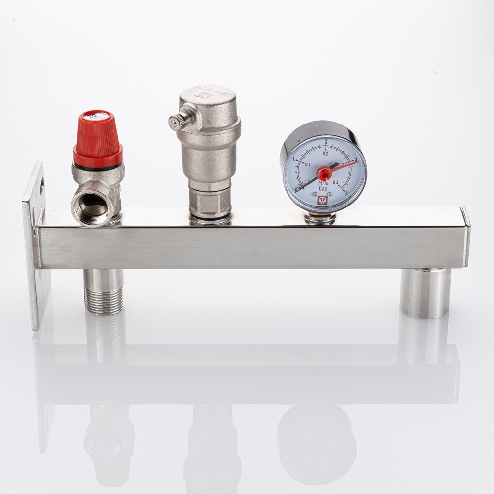 (VT.495.SS) Данная модель группы консольной группы безопасности представляет собой смонтированные на полой консоли из нержавеющей стали предохранительный клапан с фиксированной настойкой, автоматический воздухоотводчик, манометр со шкалой 0–4 или 0–10 бар.