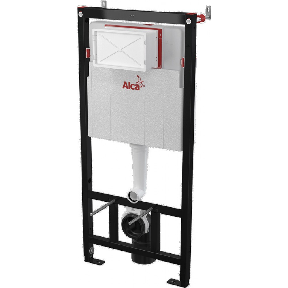 Система инсталляции подвесного унитаза спроектирована и произведена на заводе чешской фирмы Alcadrain. Предназначена для скрытого монтажа к несущей стене или в гипсокартонную стену и применяется для установки подвесного унитаза в ванных комнатах или туалетах. Представляет собой конструкцию из металлической рамы, на которой установлен сливной бачок с впускной и сливной арматурами, монтажной коробки для кнопки слива, необходимые фитинги для подключения подвесного унитаза к системе канализации и монтажные крепления.