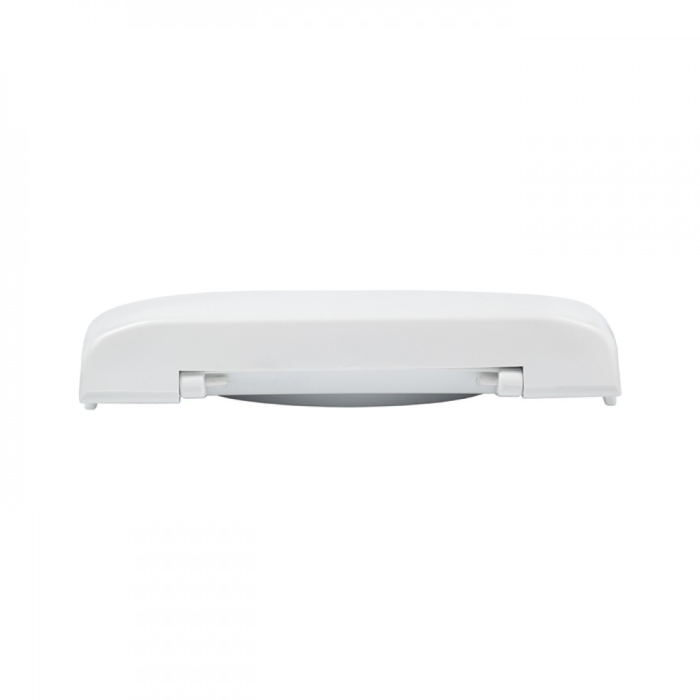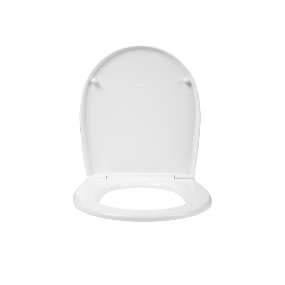 Пластиковое сиденье для унитаза белого цвета классической округлой формы.