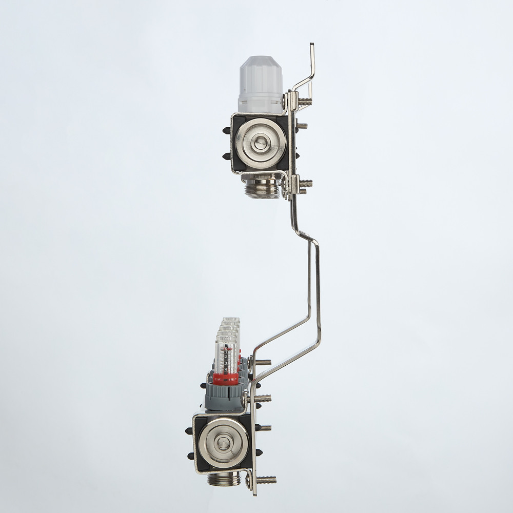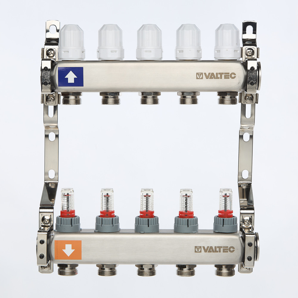Выходы обратного коллектора блока VTс.579 оборудованы регулирующими клапанами с возможностью установки электротермических сервоприводов, подающего – настроечными клапанами с расходомерами (ротаметрами). В комплект входит пара сдвоенных кронштейнов с двумя комплектами хомутов.