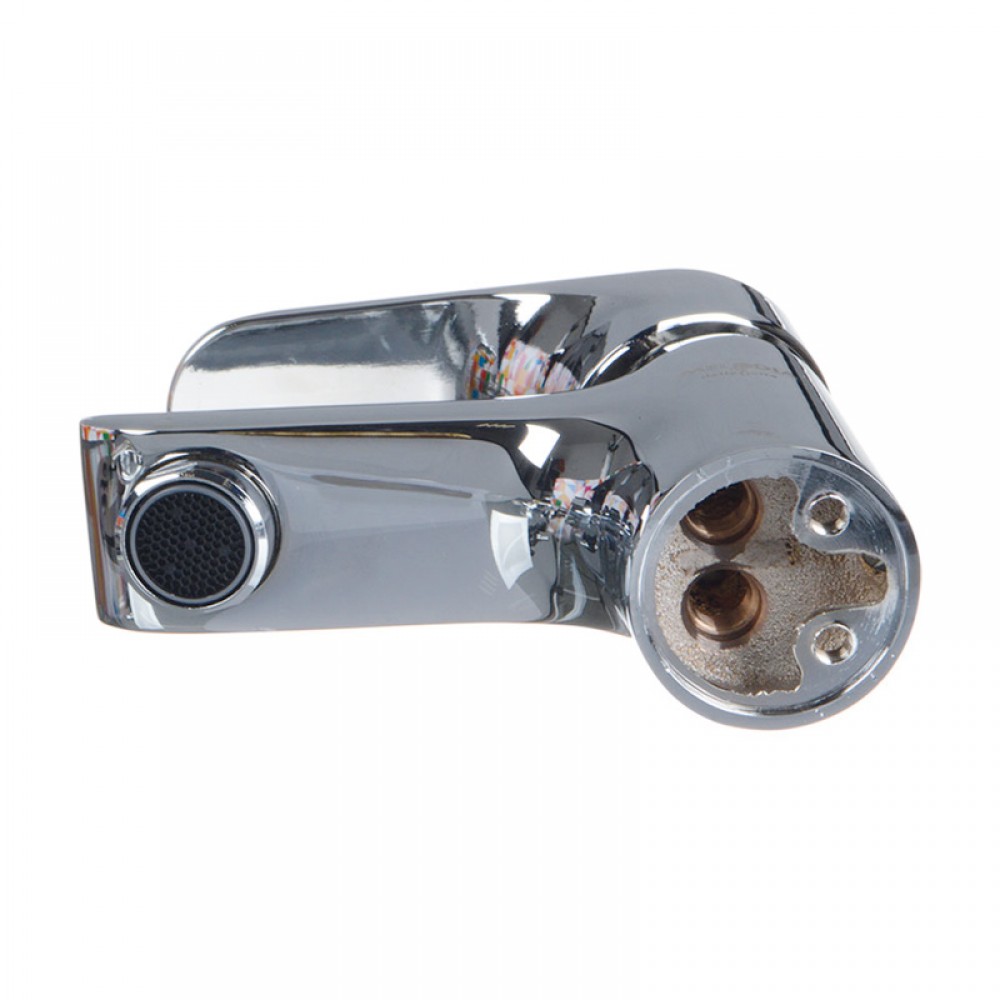 Поверхность устройства водоразбора обработана хромированным покрытием, придающим металлу зеркальный блеск. Смеситель монтируется в стандартное отверстие умывальника.