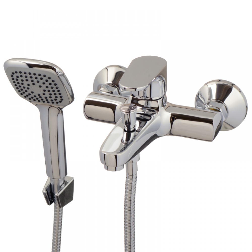 Оборудование имеет классическое настенное крепление с межосевым расстоянием 150 мм. Поверхность прибора покрыта гладким слоем хрома, который легко очищается от мыльных разводов и известкового налета. В набор также включен ручной душ.