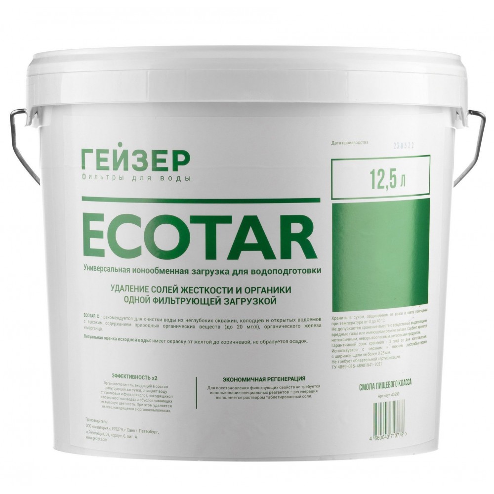 Фильтрующий материал Экотар C35 (Ecotar C35) - смесь смол рассчитанная на высокие концентрации железа и ПМО. Так же как и остальные загрузки линейки Экотар удаляет соли жесткости, аммония и марганца. Для регенерации загрузки используется раствор поваренной соли.